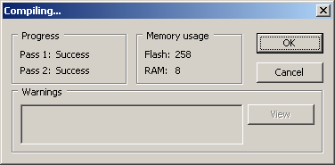 While compiling, the IDE will display a dialog with the compile's status. Compiler warnings will be displayed in the bottom portion of the dialog. Fatal errors are displayed in their own dialogs.