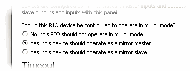 RIO devices maintain a timeout timer for every mirrored output. In the event of a communications loss between units, any affected output will be placed in an "emergency shut-down state" or "failsafe mode" as defined in this portion of the pane. In this state, the output indicator LED (if present) will flicker and the output will be driven on (high), off (low), or left as it was before the shut-down (as per your setting).