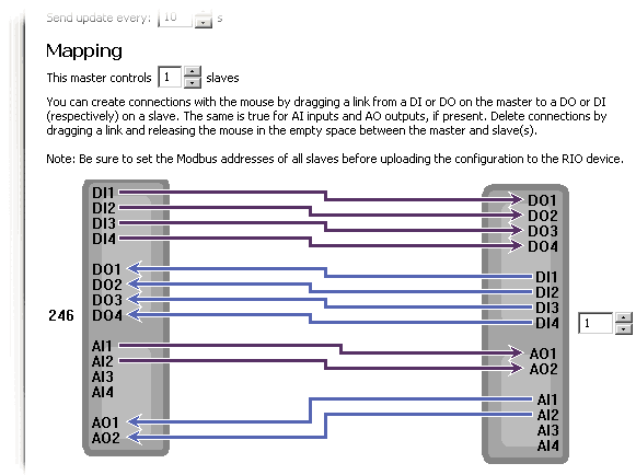In mirror mode, one RIO device is configured as a "mirror master" and one or more RIO devices are configured as "mirror slaves". Master inputs and outputs can be mapped to slave outputs and inputs with this pane.
