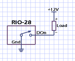 RIO-28 outputs are pulled to ground when "on". They can sink up to 200mA. Here is a typical configuration that uses the output to control a user load: