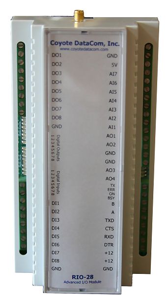 The RIO-28 is a low-cost, input-protected I/O module with seven 12-bit analog to digital inputs, four 12-bit digital to analog outputs, eight digital inputs, and eight solid-state digital outputs. Each analog input channel is configured to measure 0 to 20mA (various forms of data scaling are included). The analog output channels can drive 0 to 20mA (different scales are included). The digital input channels can accumulate pulse counts for AMR applications.